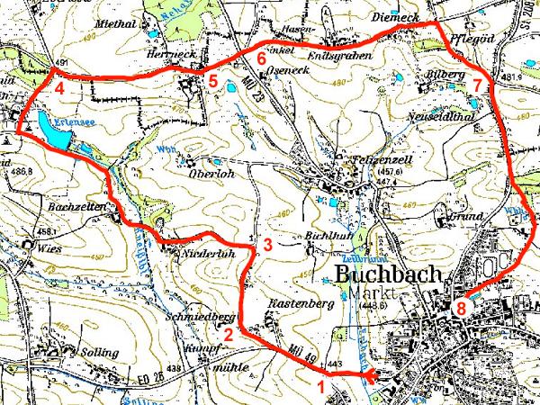 Von Endsgraben sieht man nach rechts hinunter zur Quelle des Erlbachs bei Bilberg, der über Felizenzell, Zellbründl und Steeg zur Isen fließt. Nach einem kleinen Wäldchen führt ein Feldweg rechts bergauf. Der beeindruckende Hohlweg soll wie andere seiner Art ganz von selbst entstanden sein: Die Fuhrwerke haben in vielen Jahren den Boden abgetragen und verdichtet. Wir stoßen auf die Strasse Buchbach - Velden, wo das Kriegerdenkmal an der Veldener Straße steht, das der Opfer gleich mehrerer Kriege gedenkt. Wir folgen der Straße nach rechts, Richtung Buchbach, entlang der Landkreisgrenze Mühldorf - Landshut. Im Wäldchen namens "Bräuholz" links ab (nicht der Feldweg, gleich danach die Strasse) nach Kindlbuch. Oft sind dort auf der Koppel des Reiterhofs herrliche Pferde zu bewundern. Hundert Meter weiter findet sich der Hochbehälter der Wasserversorgung: Er dient als Ausgleichsbehälter um Fördermenge und Verbrauch auszugleichen, die Höhe über Buchbach sorgt für den nötigen und gleich bleibenden Druck in unseren Wasserleitungen.