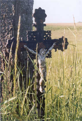 Nicht leicht zu finden liegt dieses Kreuz der Straße Buchbach - Schwindegg folgend rechts am Feldweg, der die Verlänge-rung des Weges nach "Baumann" bildet. Wer der gewundenen Kiesstraße über die kleine Steinbrücke folgt, kommt zu einer Birkenallee und findet dort unter einem der ersten Bäume im tiefen Gras dieses nicht ungepflegte schmiedeeiserne Kreuz. Es ist ein sehr altes Kreuz zum Schutz der Felder.