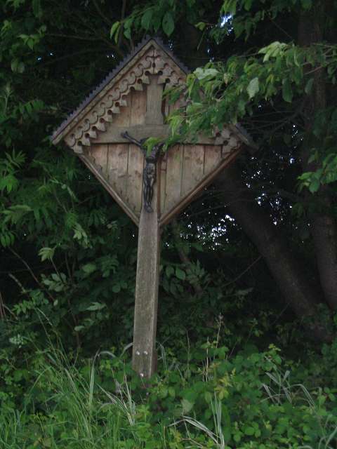 Dieses Kreuz steht vor einem Laubgestrüpp, wo sich die Straßen nach Gebensbach und Lain am See kreuzen. Es ist erst ca. 1987 aufgestellt worden. Der Wagner Karl hat es gemacht. Früher stand an selber Stelle auch schon einmal ein Kreuz, aber es war alt und kaputt. Es gehört der Fa-milie Heider, den Besitzern der Gaststätte in Lain.